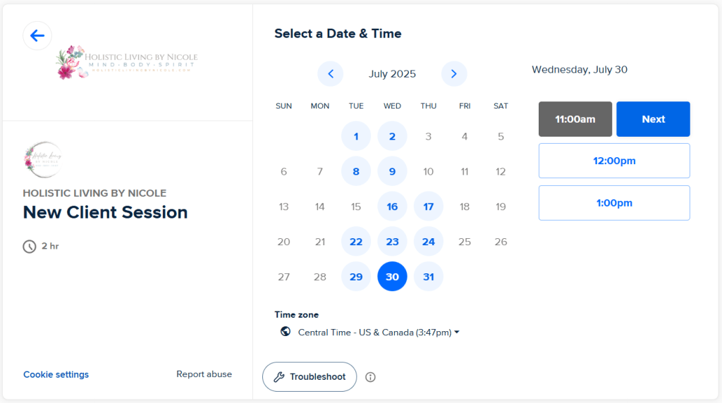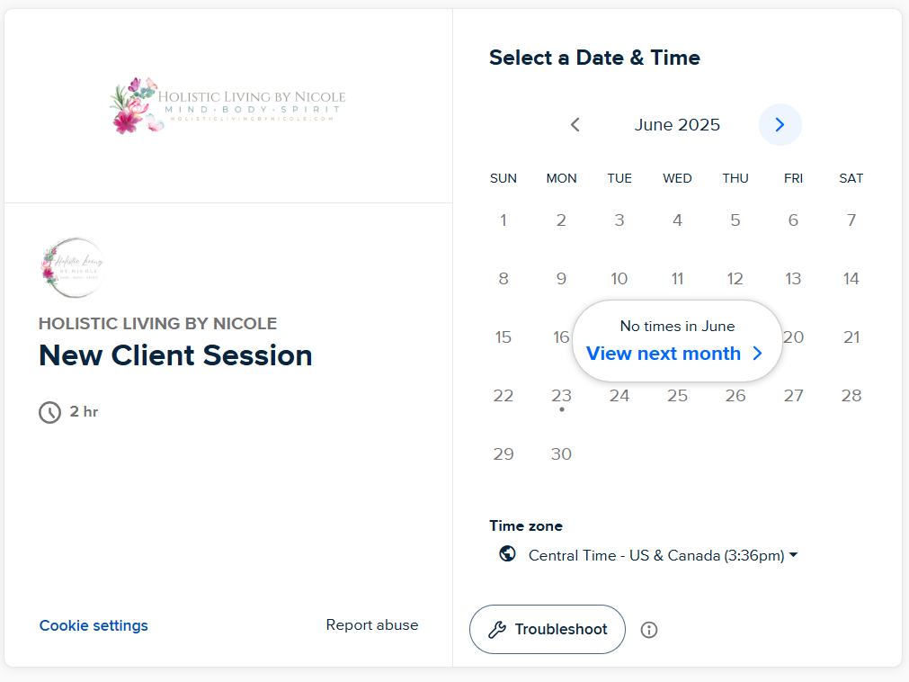 Now, you will select which day and time work best for you. If I’m booked up for the current month, you will get this message “View next month” so just click on View next month.