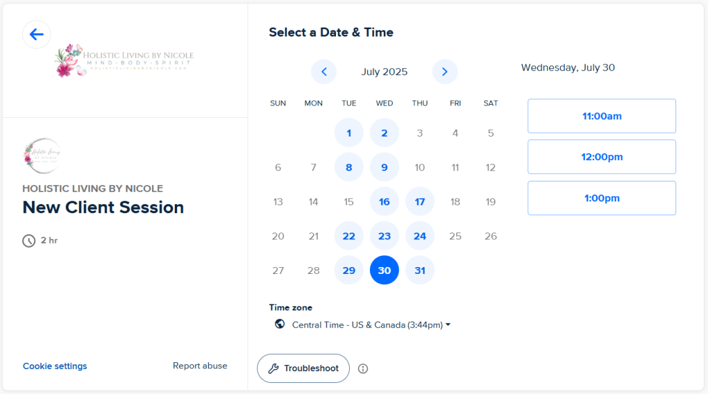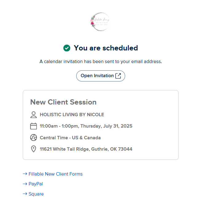 You are now scheduled. While you are on this page you also have the option to pay for your session via PayPal or Square. I also accept cash for in-person sessions.