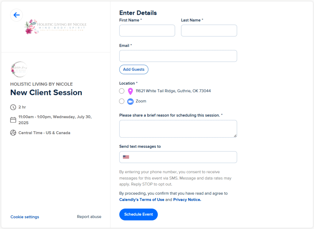 Now you will enter your details, select in-person (Address) or remote (Zoom), share a brief reason for scheduling this session and enter your number if you want to receive messages for the event.