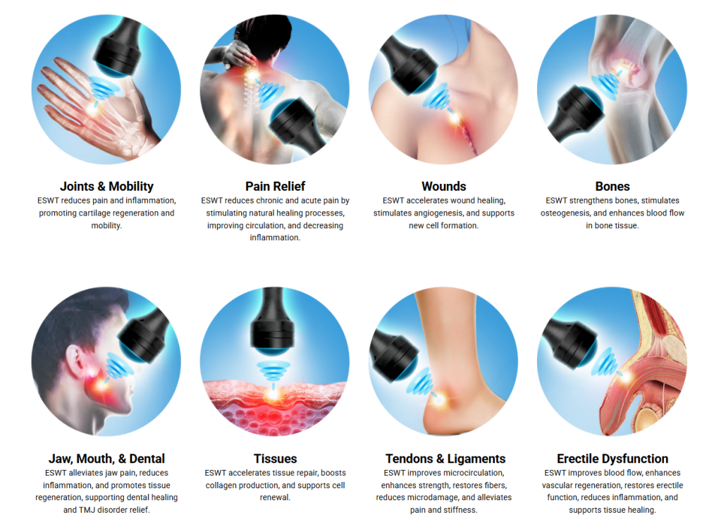 - Urology – Effectively treats erectile dysfunction, Peyronie’s disease, and enhances blood circulation in tissues.